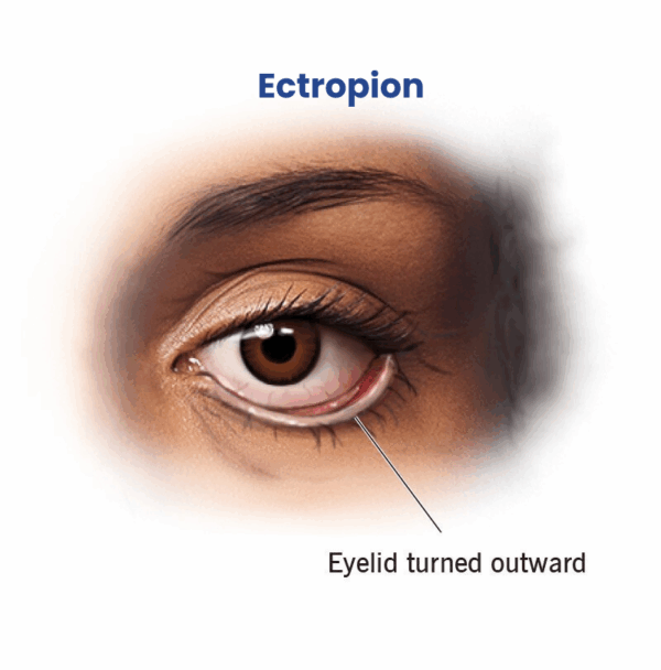 Ectropion is a common lid malposition where the lower eyelid turns outward. This can cause discomfort, redness, watering and skin irritation. Ectropion usually happens due to loosening of the eyelid muscles and ligaments over time. It is more common with age and usually affects one eye, although both eyes can be involved.